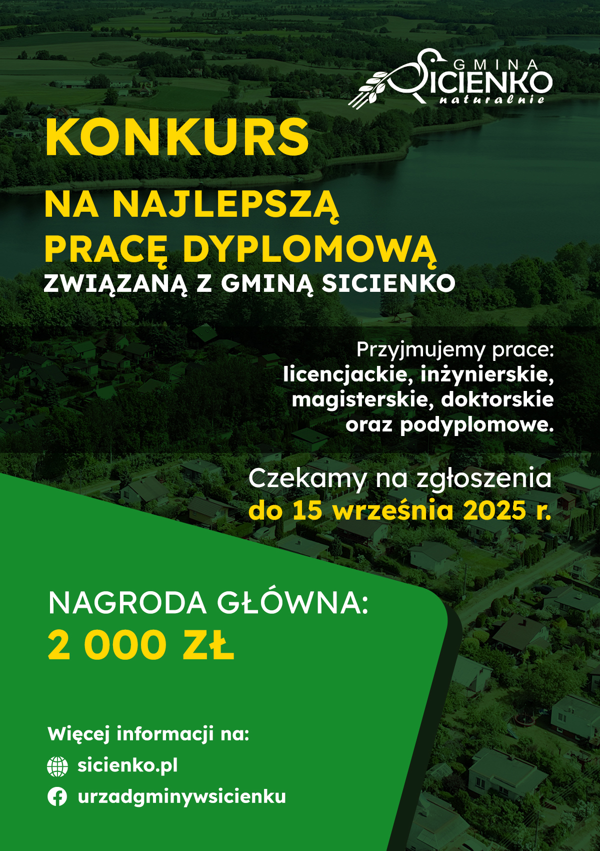 Twoja praca dyplomowa porusza tematykę związaną z funkcjonowaniem i rozwojem gminy Sicienko? Koniecznie zgłoś się do nas do 15 września 2025 r. i wygraj 2000 zł!