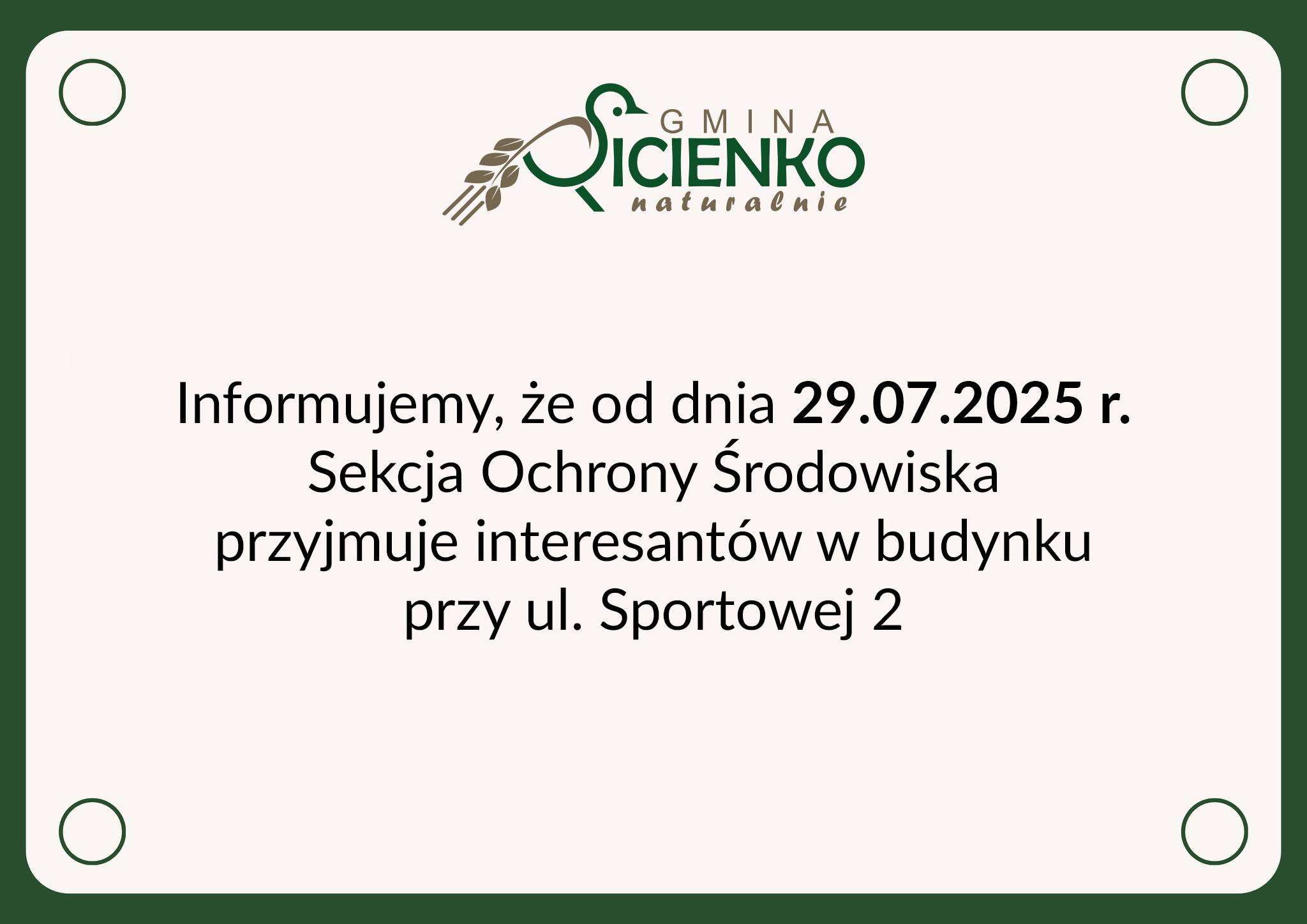 Od 29.07.2025 r. Sekcja Ochrony Środowiska przeniesiona na ul. Sportową 2. 31 Lip 2025, CzwData publikacji, 31 Lip 2025, Czw, Concept INTERMEDIAAutor, Concept INTERMEDIA, 368Ilość wyświetleń, 368